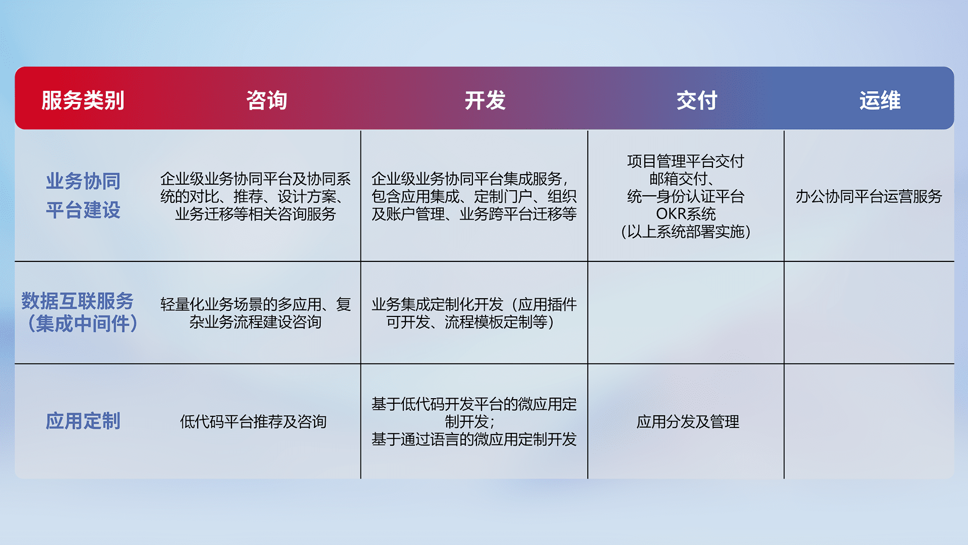 针对钉钉、、、企微、、IDaas等平台级产品提供产品的规划、、方案、、、交付、、、定制化开发等服务,,实现如统一协同办公、、、、智能客户服务、、混合会议管理、、、智能数据查询、、、、等业务场景,,,,实现数字化转型。。。